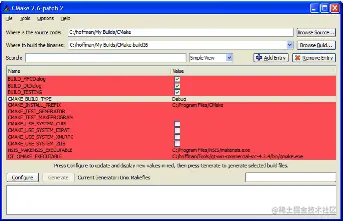 由于缓存值可以在命令执行的过程中被修改,所以最终构建的过程可以是反复的。例如,打开一个选项可能会显示额外的选项。出于这个原因,GUI禁用了 "生成 "按钮,直到用户有机会看到所有选项至少一次。每次按下configure按钮,尚未显示给用户的新缓存变量都会以红色显示。一旦在配置运行期间没有新的缓存变量创建,生成按钮就会被启用。