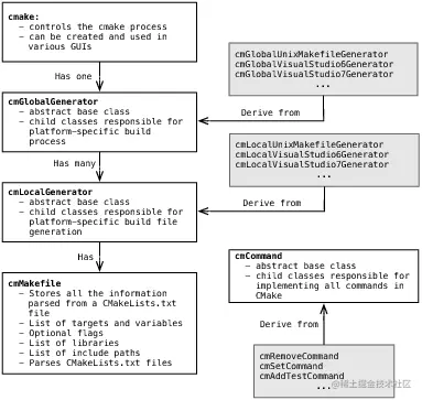 CMake是一个使用继承、设计模式和封装的面向对象系统。主要的C++对象及其关系可参见图5.2。