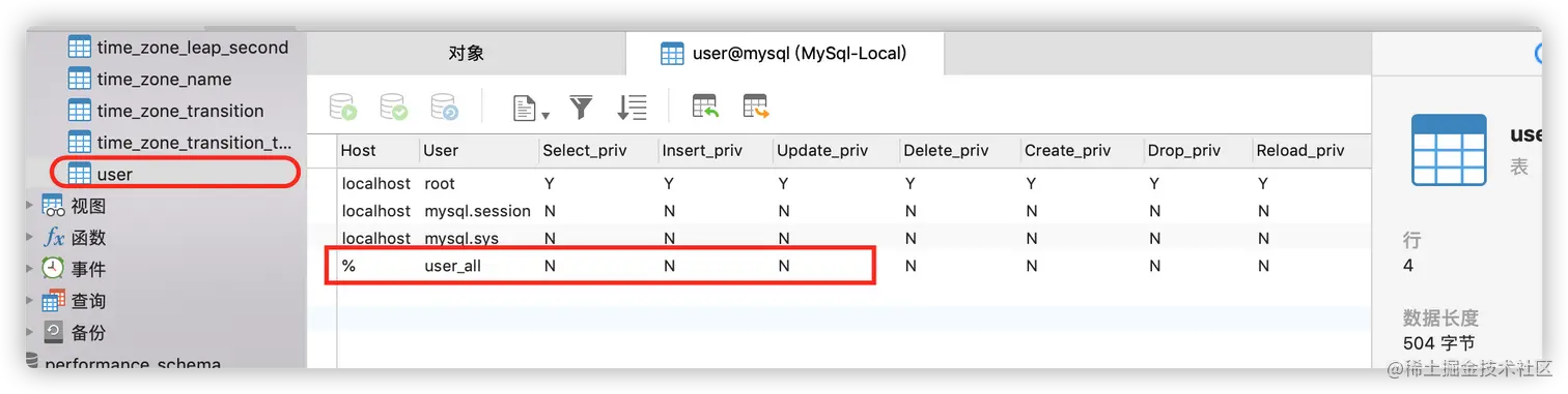 那么就来创建一个用户 user_all 测试一下: