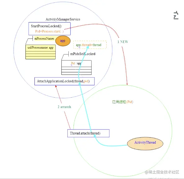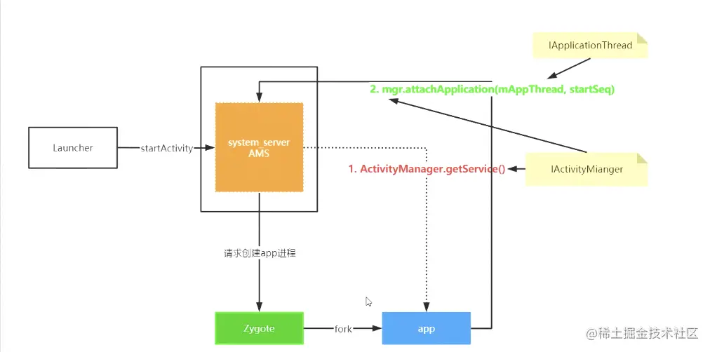 应用没有启动时,点击app,一定会调用startProcessLocked()函数,通过zogyte去fork一个app进程,接下来就是应用进程和AMS两者的事情了,应用进程去调用AMS的方法,比如startActivity,很容易调用,因为AMS是一个有名称的Binder服务,在任意的地方都可以通过在ServiceManager(SM)里面查询拿到代理类,应用进程fork完第一件事情就是进行attach,attach过程就是为了把我的代理类交给AMS,应用进程有AMS的代理类对象,AMS也有应用进程的代理类对象,接下来这两者就可以进行交流了,这个就是startActivity的启动流程了。