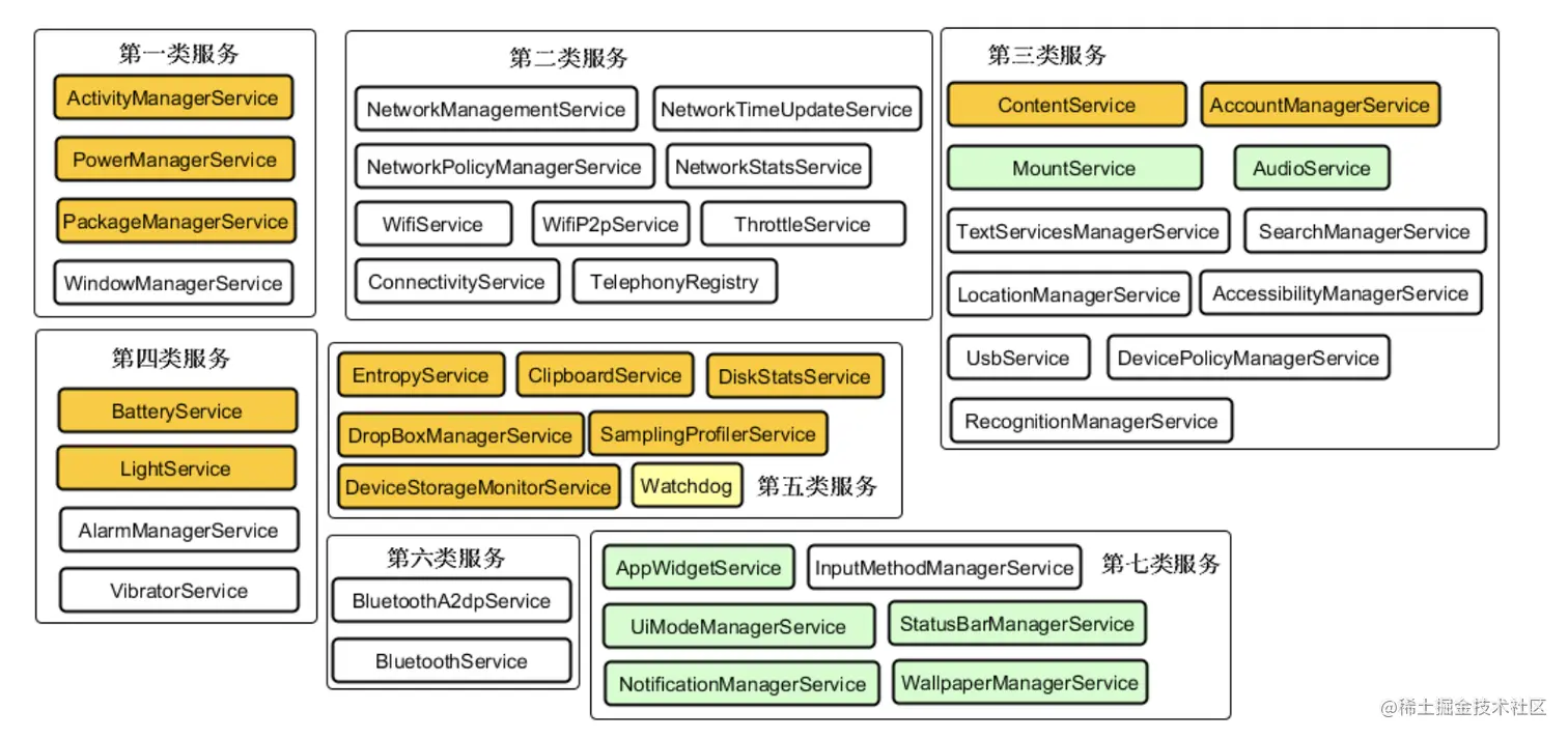 · 位于第一大类的是Android的核心服务,如ActivityManagerService、WindowManagerService等。