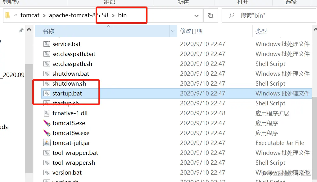 bin文件夹,点击进去,找到startup.bat文件,双击