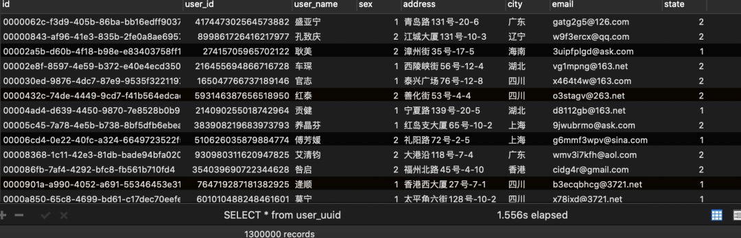 根据控制变量法,我们只把每个表的主键使用不同的策略生成,而其他的字段完全一样,然后测试一下表的插入速度和查询速度: