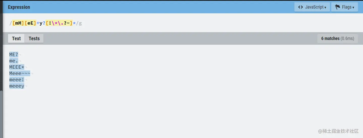 RegExp构造函数接收两个参数:要匹配的字符串模式(pattern)和可选的标志字符串(flags),标志字符串和字面量的三个标志含义相同:’g’、’i’、’m’。