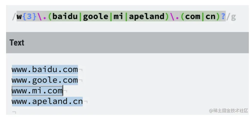 console.log(/w{3}\.(baidu|goole|mi|apeland)\.(?:com|cn)?/.test('www.baidu.com'));
