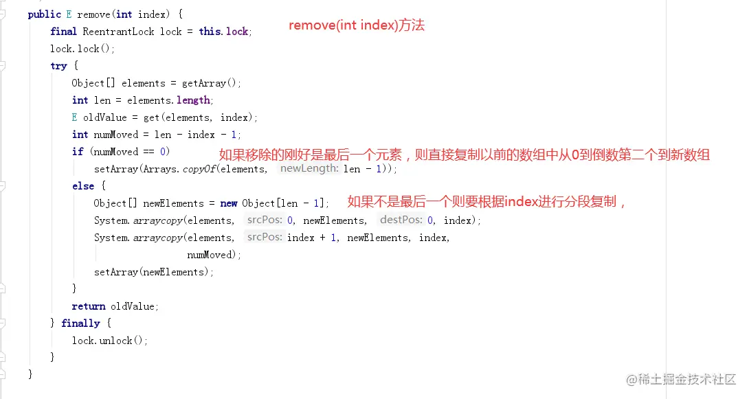移除指定索引方法还是比较简单的,仍然是先获取到锁,然后判断索引位置,如果是最后一个元素,则只用把旧数组中从0到倒数第二个的元素复制到新的数组中就行了。如果不是最后一个旧数组按索引位置分段复制到新数组就行。