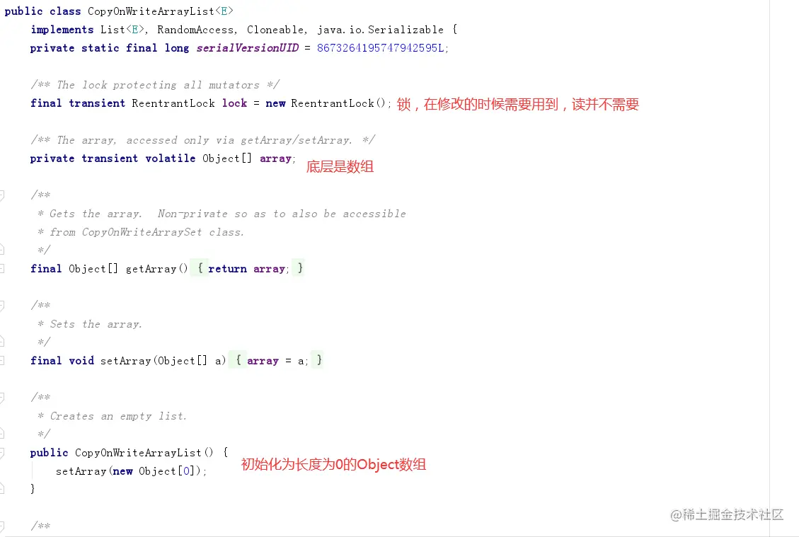 在Java中CopyOnWrite集合只有两个类CopyOnWriteArrayList、CopyOnWriteArraySet,而CopyOnWriteArraySet是基于CopyOnWriteArrayList实现的,所以我们只用看看CopyOnWriteArrayList的实现就能清楚CopyOnWrite的实现了。