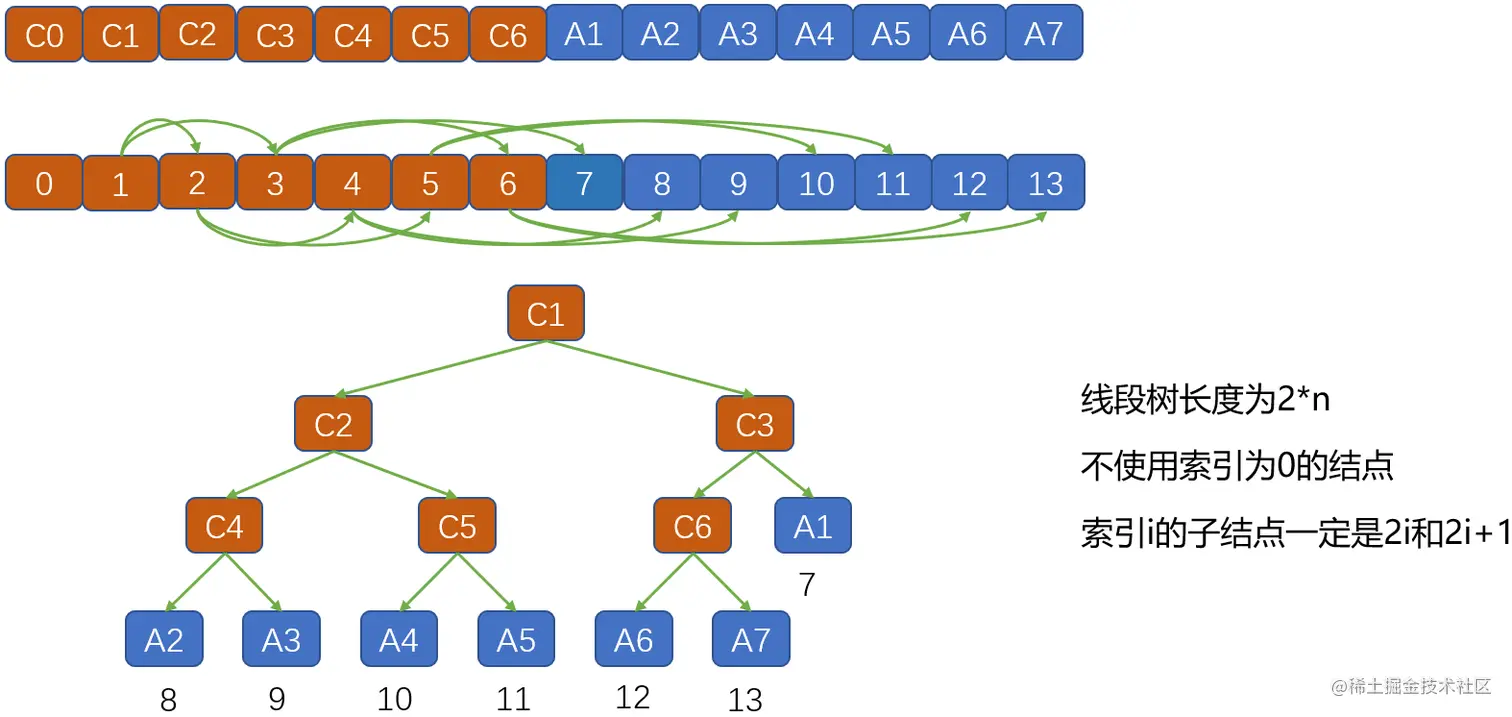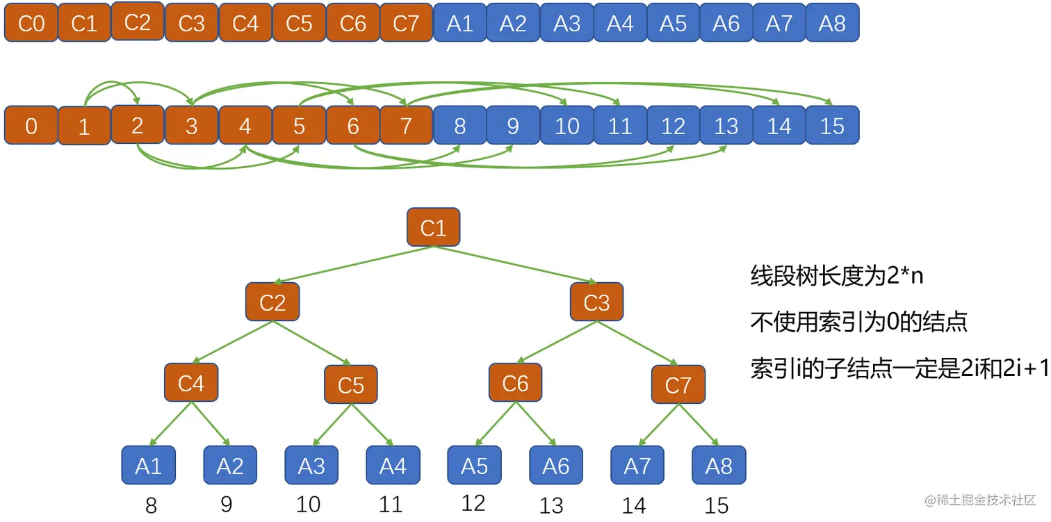 如果索引 处的元素不是一个叶节点,那么其左子节点和右子节点分别存储在索引为 和 的元素处。该特性要求线段树不使用数组中下标为0的元素。该规律对任意长度的原始数组都成立。