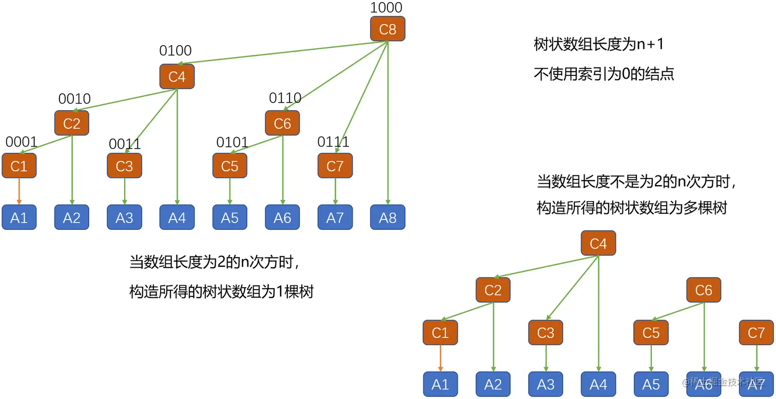 构造的树状数组不含原始数组,树状数组长度为原始数组的长度+1。