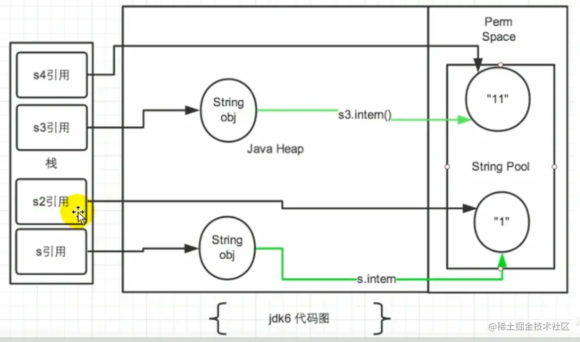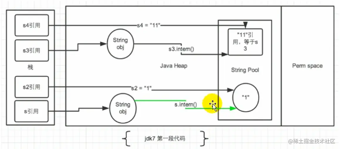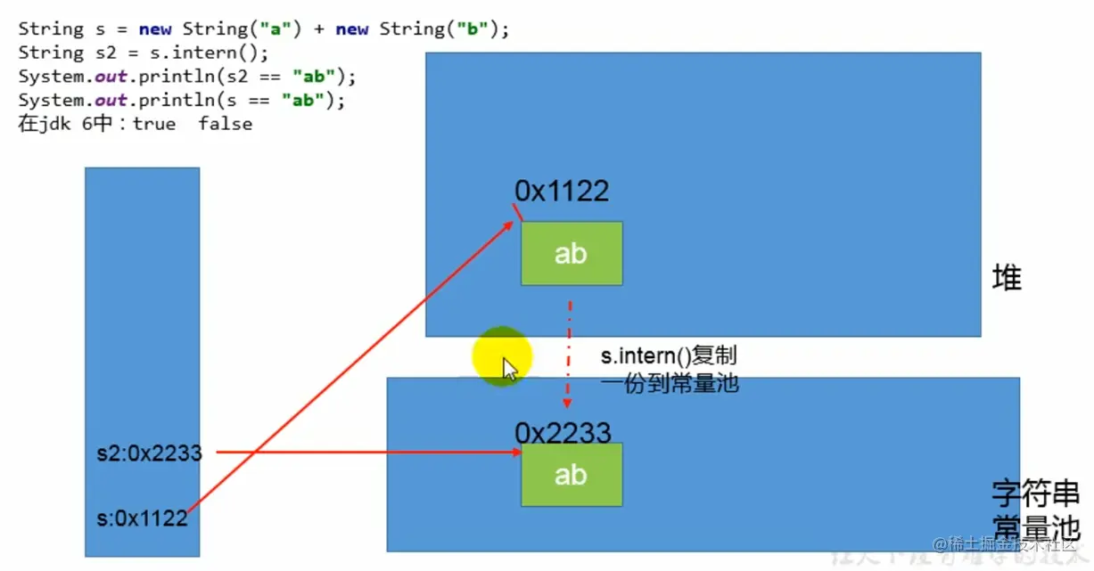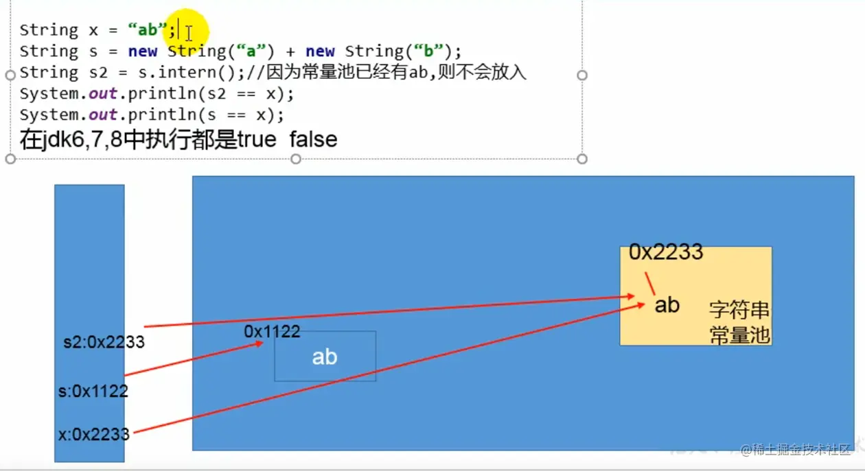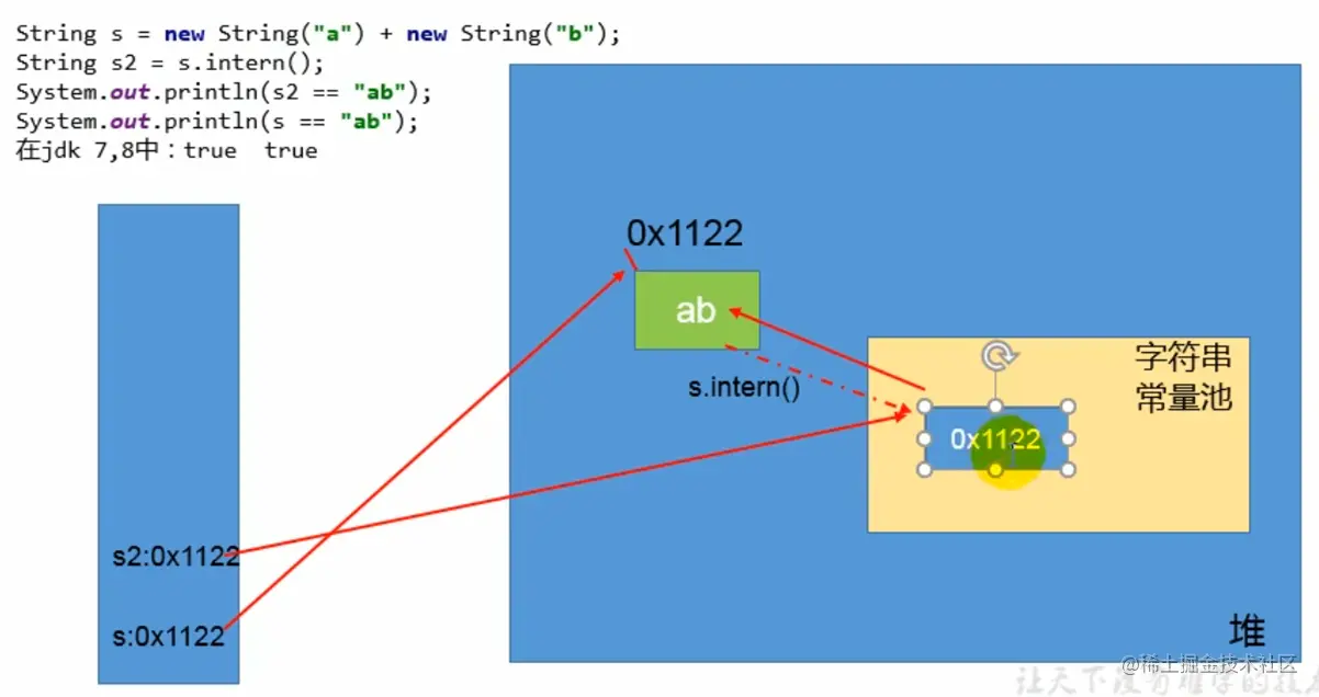 - JDK 7/8 中:串池中没有创建字符串"ab",而是创建一个引用,指向new String("ab"),将此引用返回