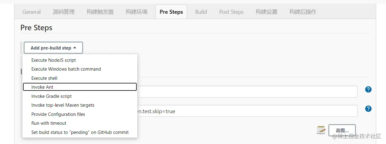 Pre Steps是在构建前的一些常规操作,这个最好根据自己的实际项目情况来,目前我的项目中不存在此类操作,具体的可操作类型可以看下拉选择框,最常用的一般就是windows下的"Execute Windows batch command"和Linux下的"Execute shell",前者是cmd命令后者是shell命令的执行。