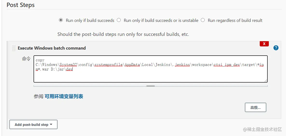 Post Steps 是在编译完后,Jenkins的操作,主要设置是在编译成功后,利用批处理命令将war包拷贝到指定目录下即可。