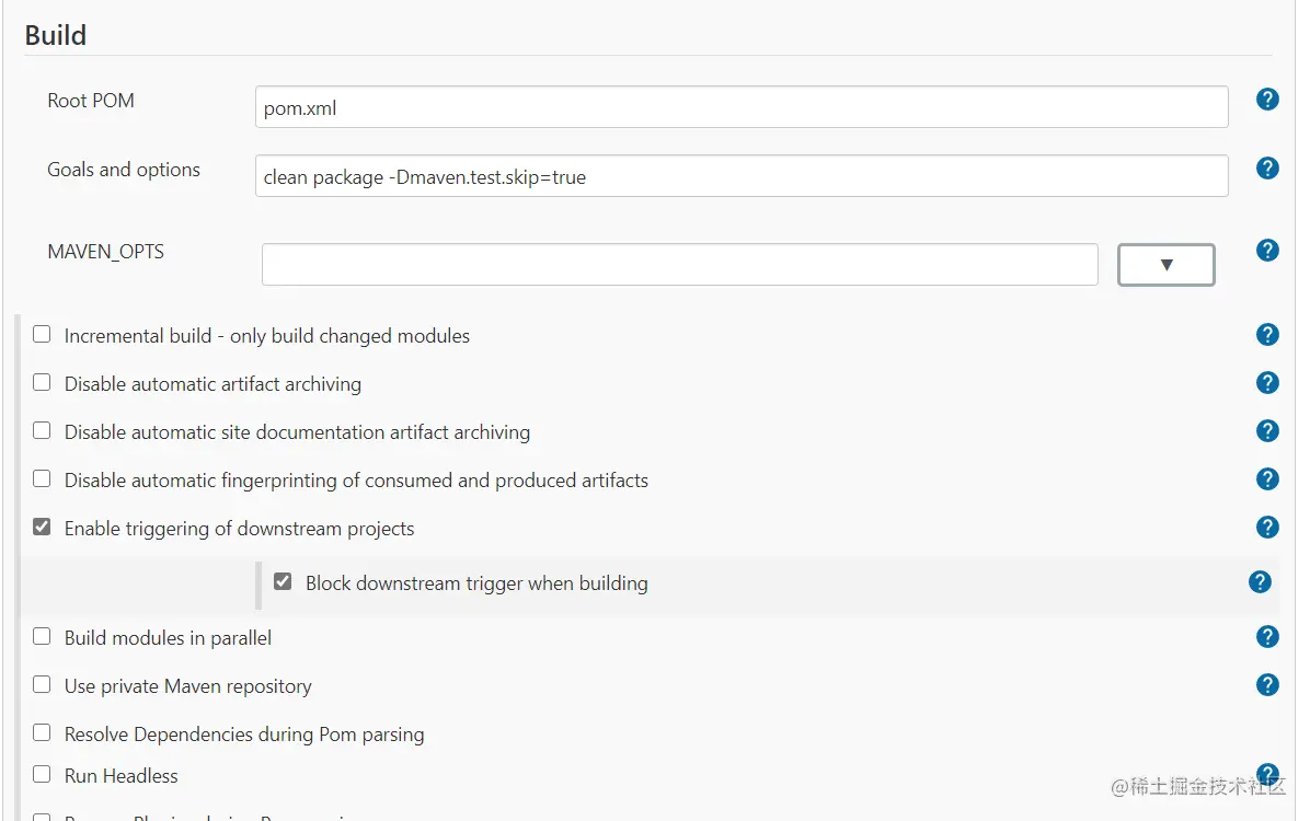 Build 是构建中的操作,主要是为了设置好POM文件,让jenkins在编译的过程中可以找到项目的依赖,并且设置了编译时的方式是不执行测试用例,也不编译测试用例类。