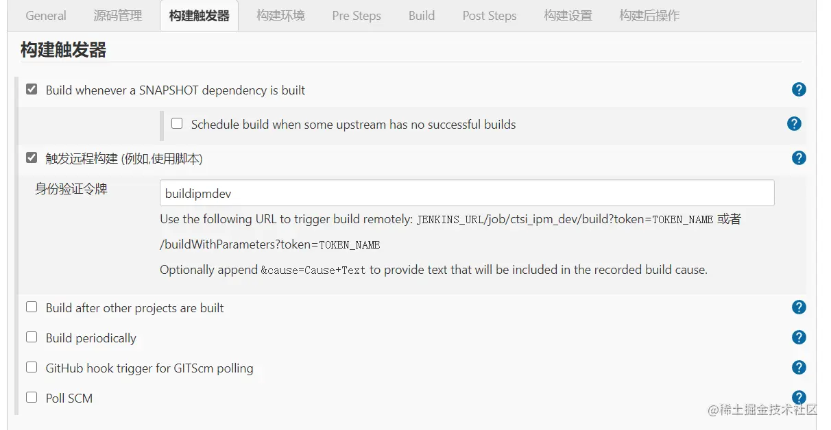 构建触发器 主要是为了设置 远程构建的能力,该能力可以让同一局域网的用户通过访问url路径就可以触发远程服务器的代码构建工作,其主要的设置是一个token值,即 身份证令牌 的值 ,设置好后,远程用户可以在浏览器中通过https://JenkinsIP:Port//job/任务名称/build?token=`身份证令牌值` 这个路径进行远程构建了。