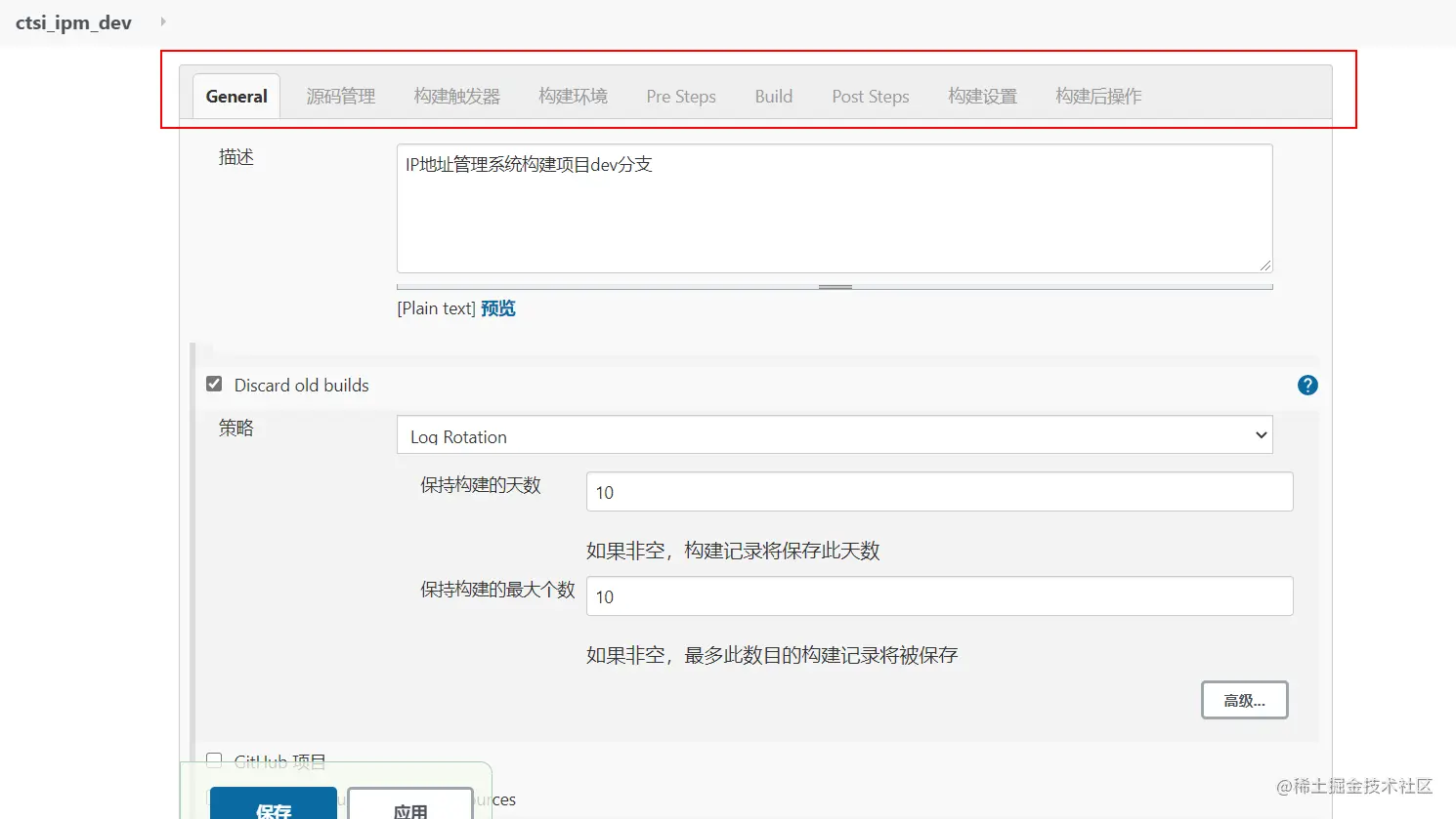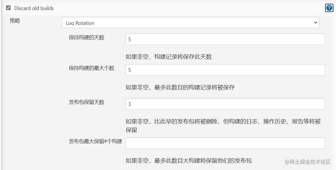 General中我主要设置的是Discard old Builds ,根据设置定期删除旧的构建,此举主要是为了节省磁盘空间: