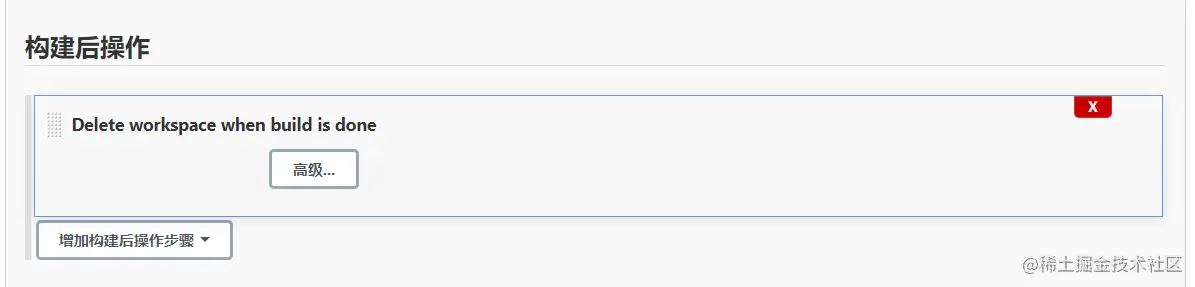 构建后操作 其实本质上和构建前操作一样,就是我们在项目构建后应该做什么操作,我做的操作是 Delete workspace when build is done, 构建完成后删除工作空间,目的也是为了节省空间。
