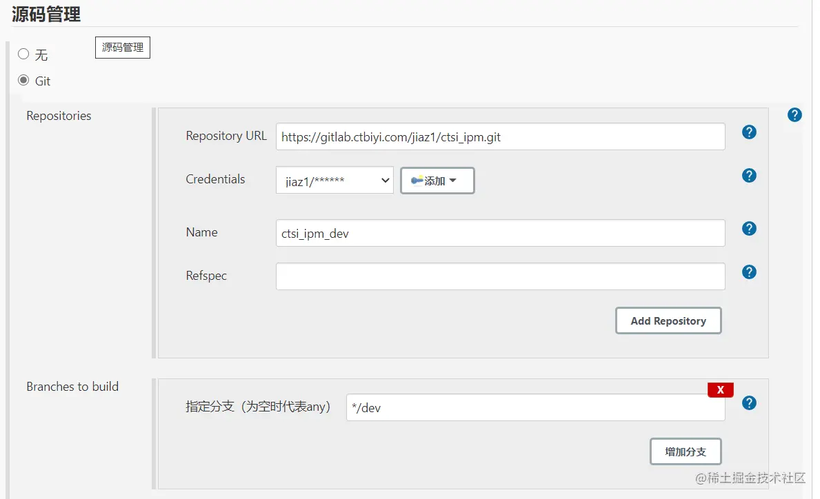 源码管理主要是为了设置需要编译项目的git地址,git的用户名密码以及代码所属分支等信息。