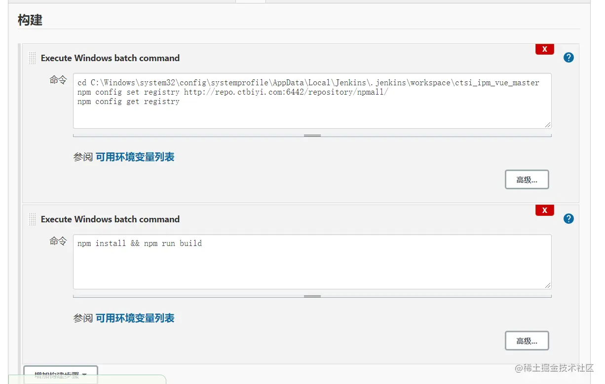 其次是自由类型项目的设置比Maven项目少几项,而且有一个Node.JS的特殊配置,但是其构建的整体思路是没有变化的。