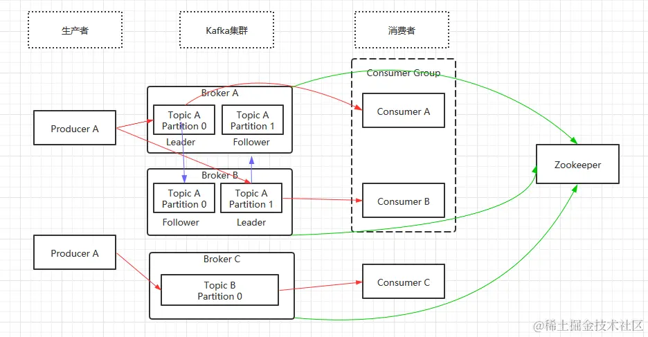 注1:图中的红色箭头表示消息的流动过程,蓝色表示分区备份,绿色表示kafka集群注册到zookeeper。