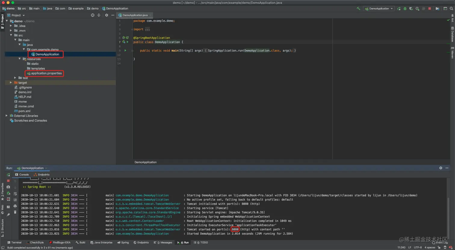 其中的DemoApplication是项目的启动类,里面有一个main()方法就是用来启动SpringBoot。application.properties是SpringBoot的配置文件。此时可以启动项目,在DemoApplication运行main方法即可启动,启动成功如上图,由于SpringBoot默认内置了Tomcat,因此启动的默认端口就是8080。