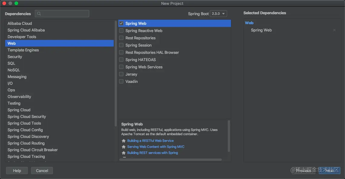 选择自己所需要的依赖、SpringBoot的版本,SpringBoot与各个框架适配都是以starter方式,这里我们选择WEB开发的所需的starter即可,如下图: