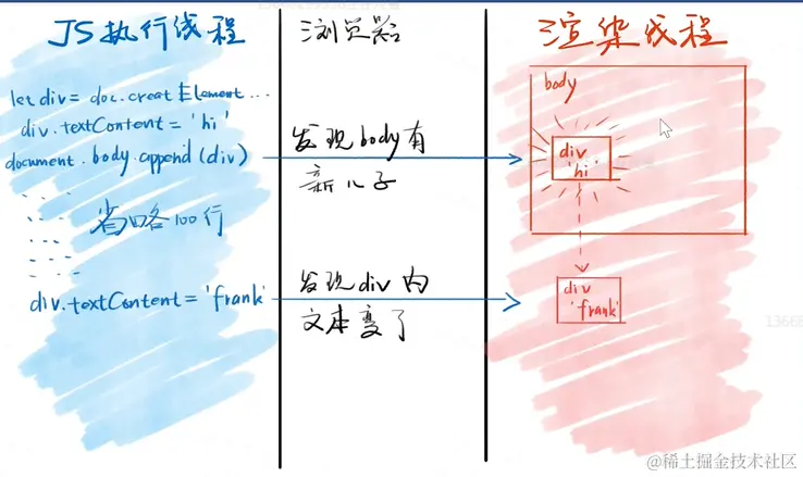 在div1放入页面之前对div1进行的所有操作都是在JS线程中进行的在div1放入页面之时浏览器发现了JS的意图,通知渲染线程在页面中渲染div1对应的元素把div1放入页面之后当你想对div1再次进行操作时,都会有可能触发重新渲染