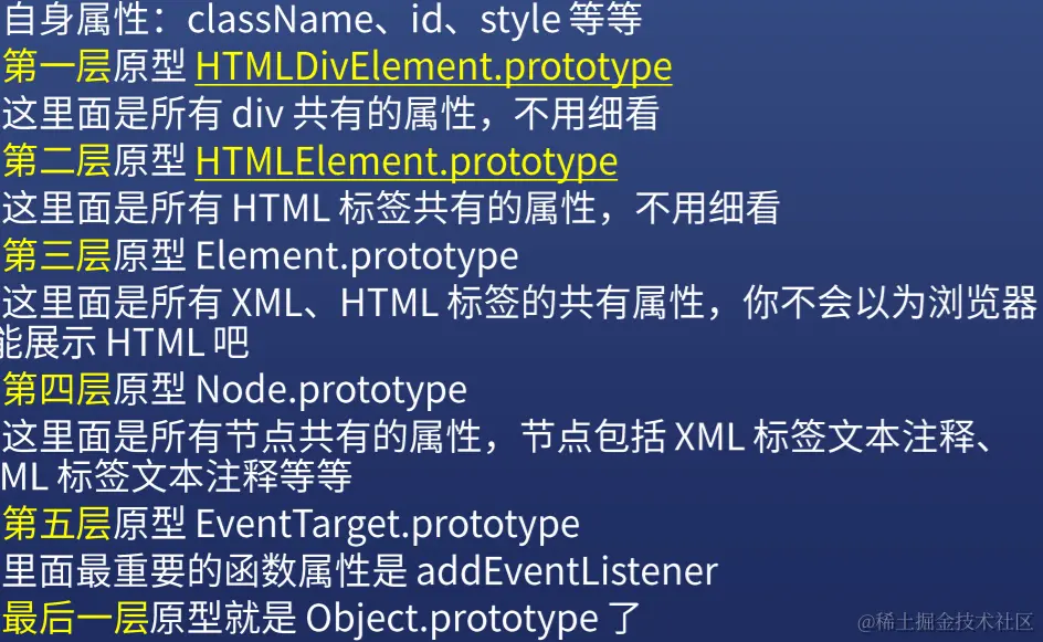显然获取到的元素是个对象抓一只div对象来看看都有啥console.dir(div);div的6层原型链