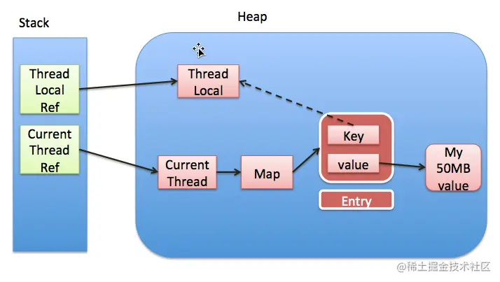 不结束的话,这些 key 为 null 的 Entry 的 value 就会一直存在一条强引用链:Thread Ref -> Thread -> ThreadLocalMap -> Entry -> value