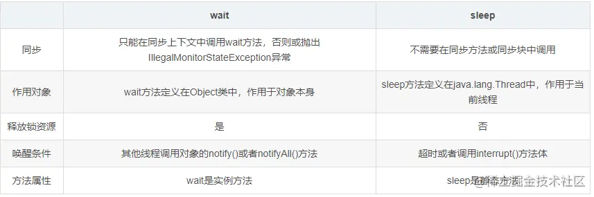 不释放已获取的锁资源,如果sleep方法在同步上下文中调用,那么其他线程是无法进入到当前同步块或者同步方法中的;wait方法释放对象资源