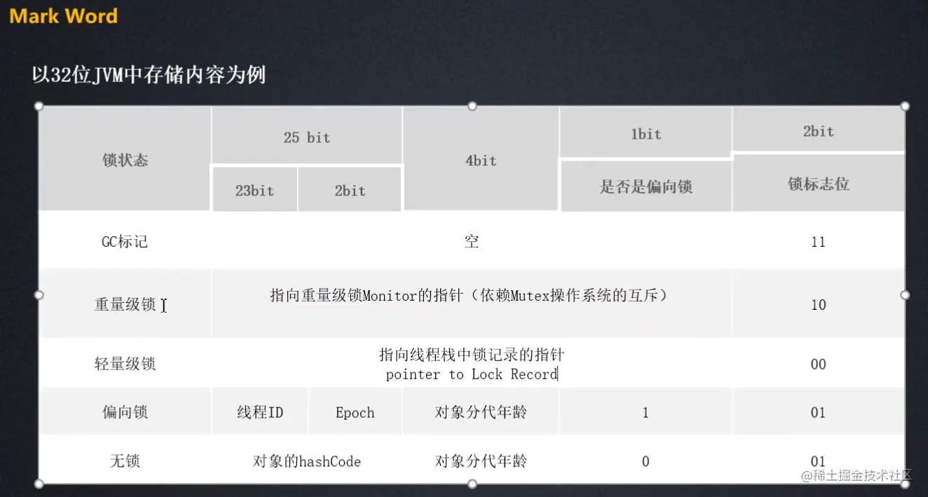 下面是对象的mark标记位,锁升级后,不会降级