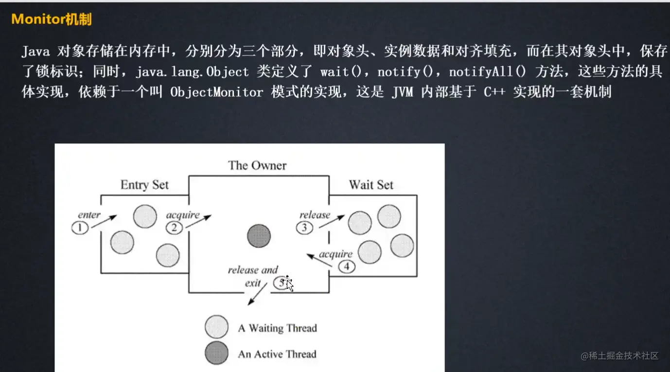 ychronize的实现,依赖于jvm的objectmonitor方法 monitor机制,在java对象中,实现了wiat方法和notify方法,