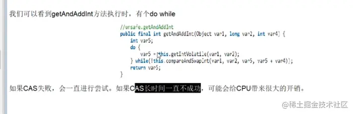 使用cas保证数据的原子性,通过while方法,将内存的最新值和原始获取的值对比,如果没修改,就直接执行加操作,否则重新获取内存的最新值再执行加操作。这里的核心是通过cas对内存执行操作。(也就是while不断地地去刷新比较,直到值没有改变才去更新),如果有10个线程并发修改,也就最多执行10即可修改到值