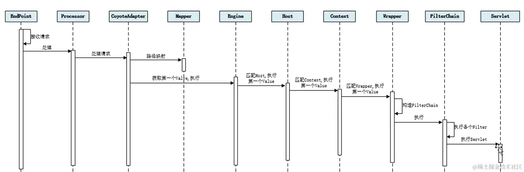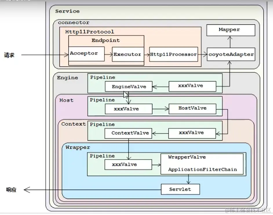 engine ,host,context,wrapper是链式的调用,在filterchain中执行过滤器和具体的servlet,用户实现的servlet实现了具体方法,在这里执行