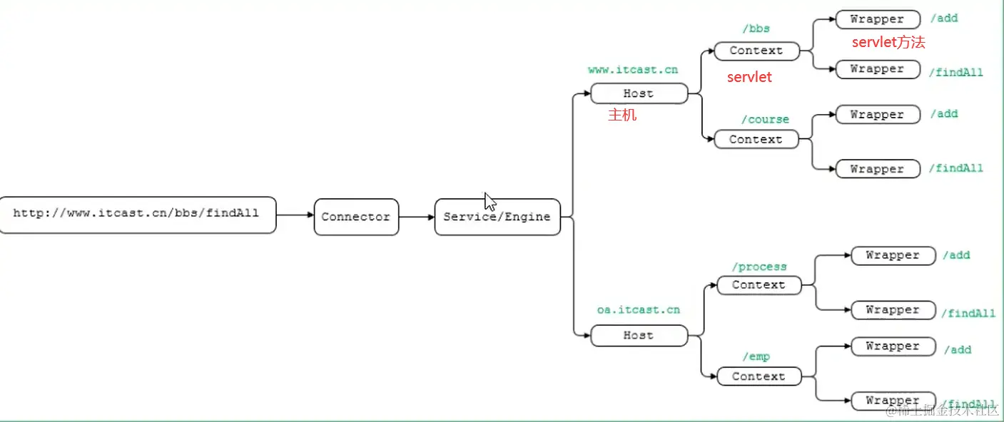 host一个主机,context(一个服务程序存放在一个server中),wrapper 服务里面的servlet