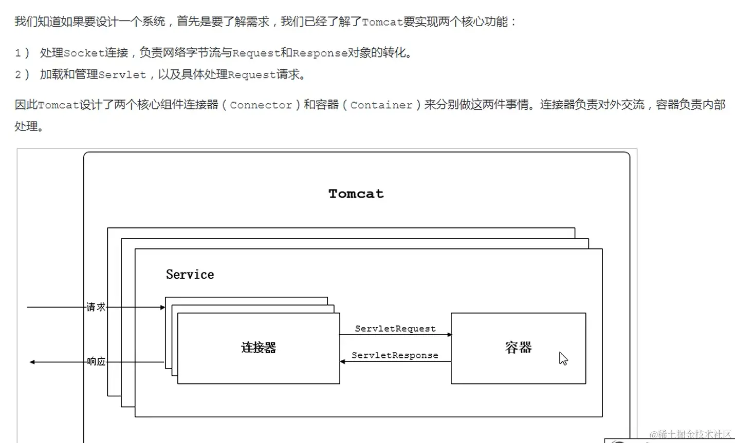 tomcat分为连接器和容器,连接器负载接收socket,容器执行具体逻辑,;连接器和容器的交流是servletrequest和servletresponse