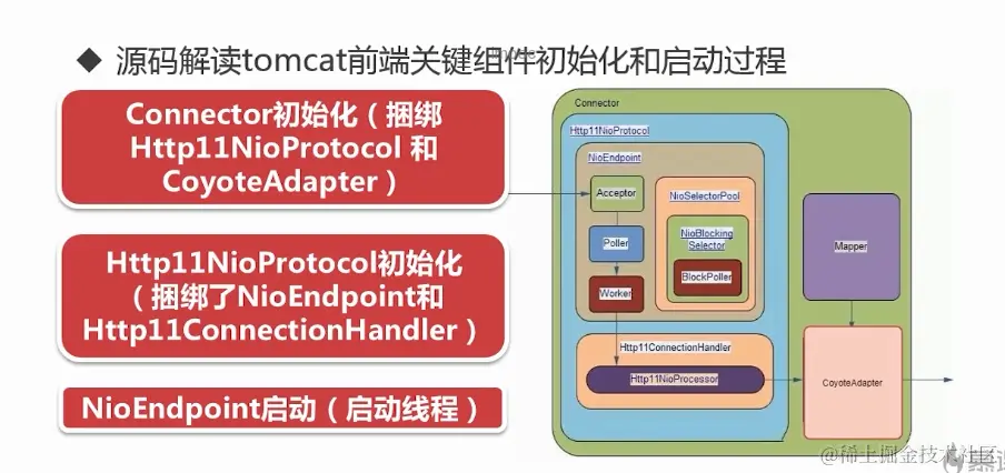 (这个过程加载tomcat配置文件,初始化容器组件,监听对应的端口,准备通过protocolhandler接收客户端请求)