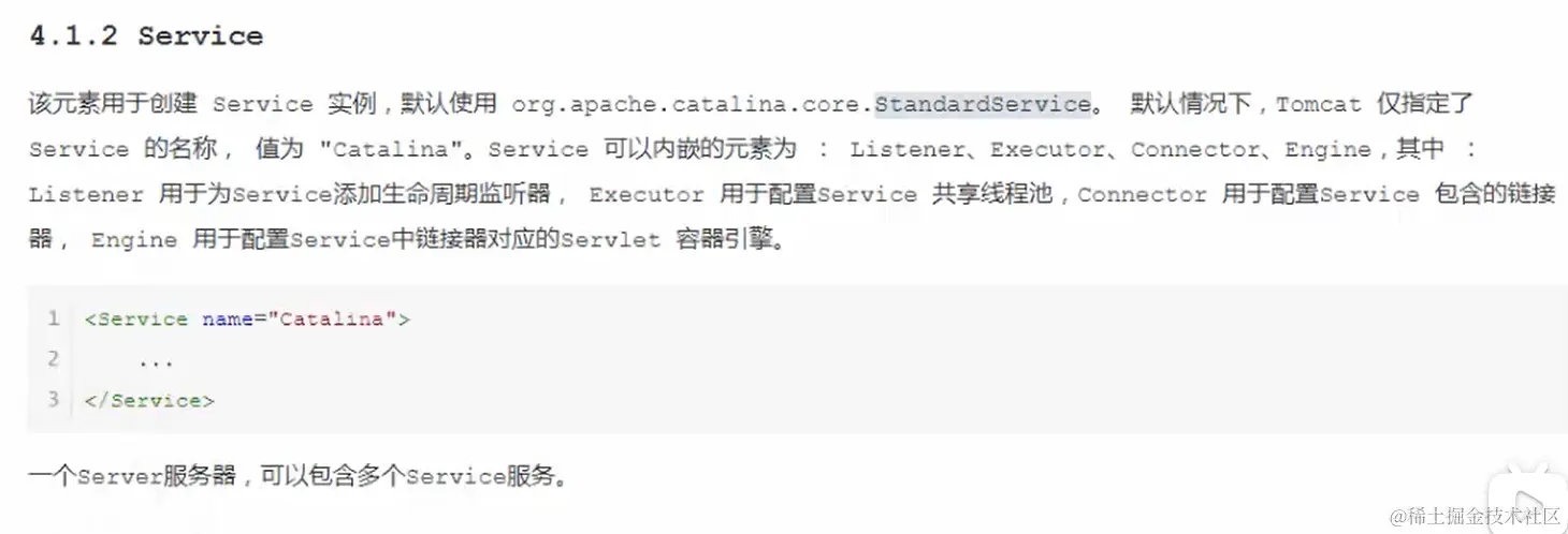 service服务是server服务的内部组件,一个server包含多个service,它将一个connecter绑定在多个connector组件上