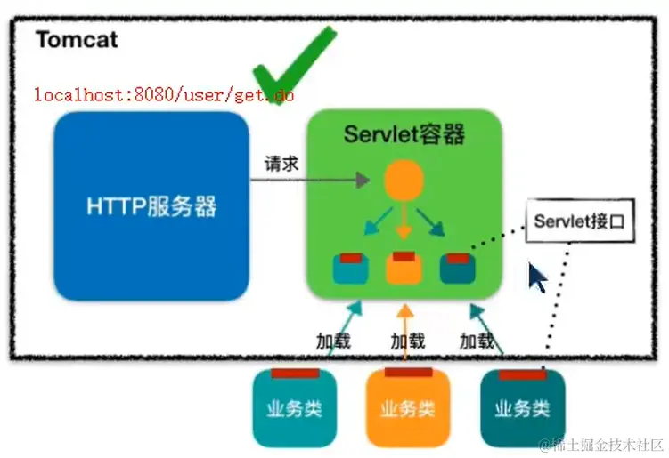 最简单版本,tomcat的核心是servlet,请求过来通过加载的servlet对请求处理,并返回结果