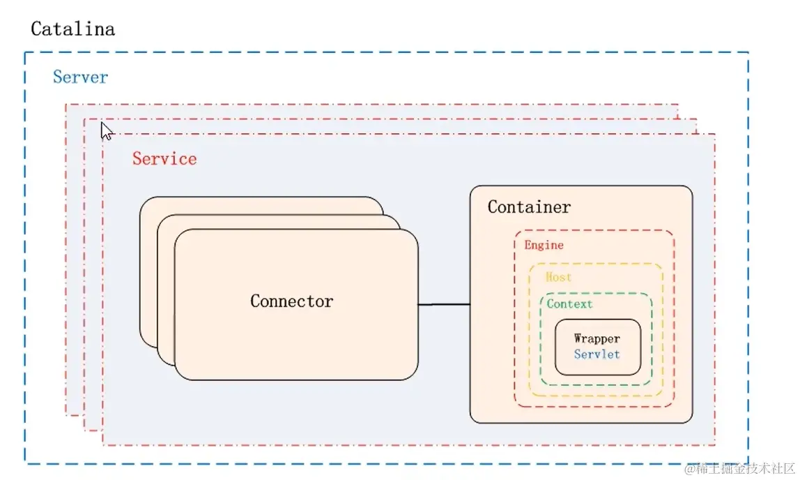server服务器表示整个catalina servlet容器及其组件,负责组装比启动servlet引擎,tomcat连接,servlet通过实现liftcycle接口,提供一种优雅的启动和关闭整个系统的方式
