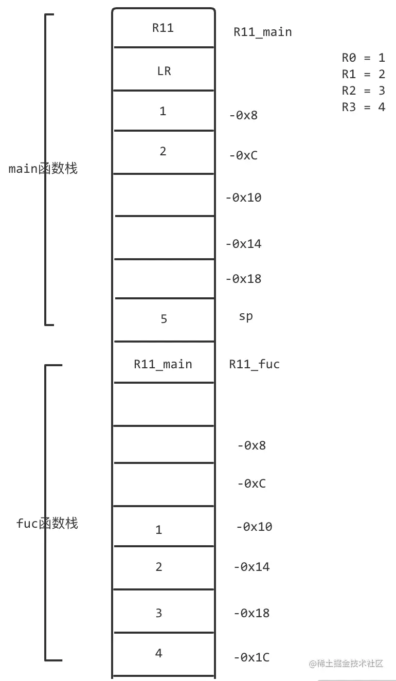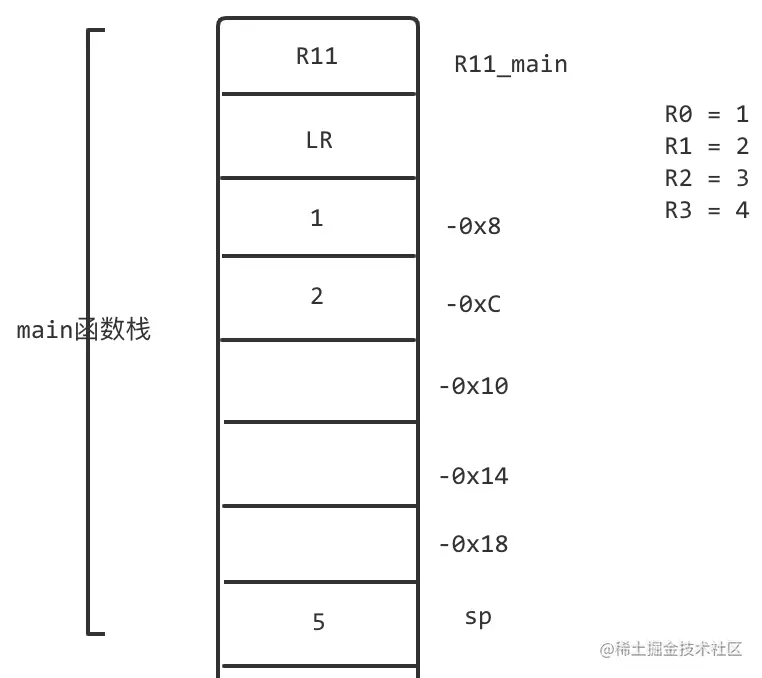 SUB R3, R11, #-var_14 ; 获取数组在栈上首地址。数组首地址放到r0中,作为参数传递
