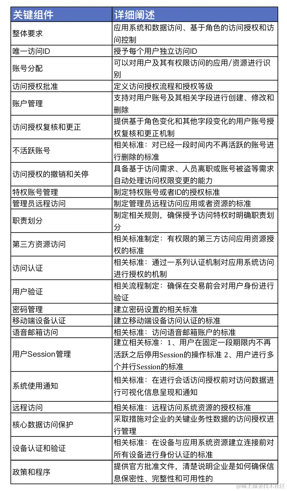 下面这张表格非常详细的地展示了身份与访问管理合规中的一些关键组件和详细描述: