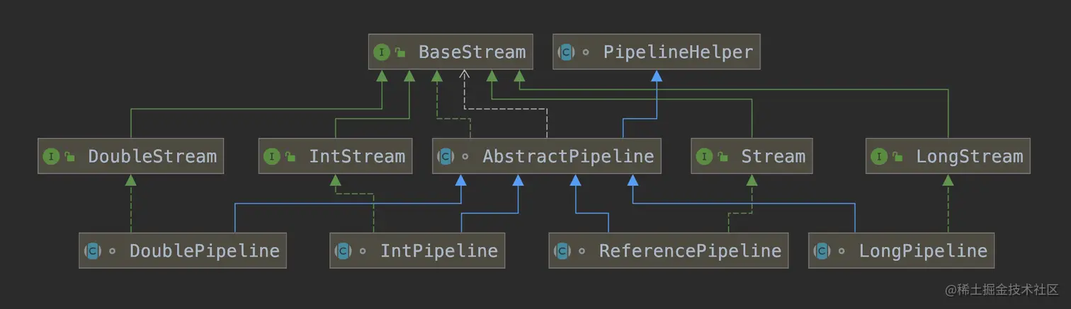 每种Stream又有对应pipeline的实现类:ReferencePipeline、IntPipeline、LongPipeline、DoublePipeline,pipeline的概念下一节具体介绍。