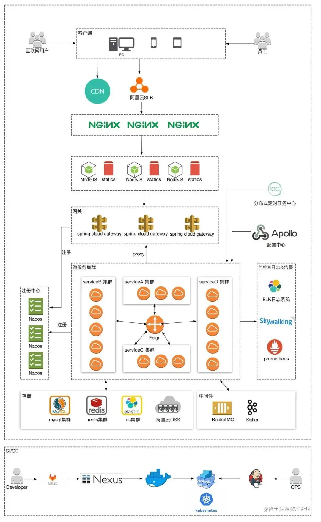 下图是我基于云原生微服务架构设计的架构图其中前端流量是通过 SLB -> NGINX -> API Gateway 再到具体服务。