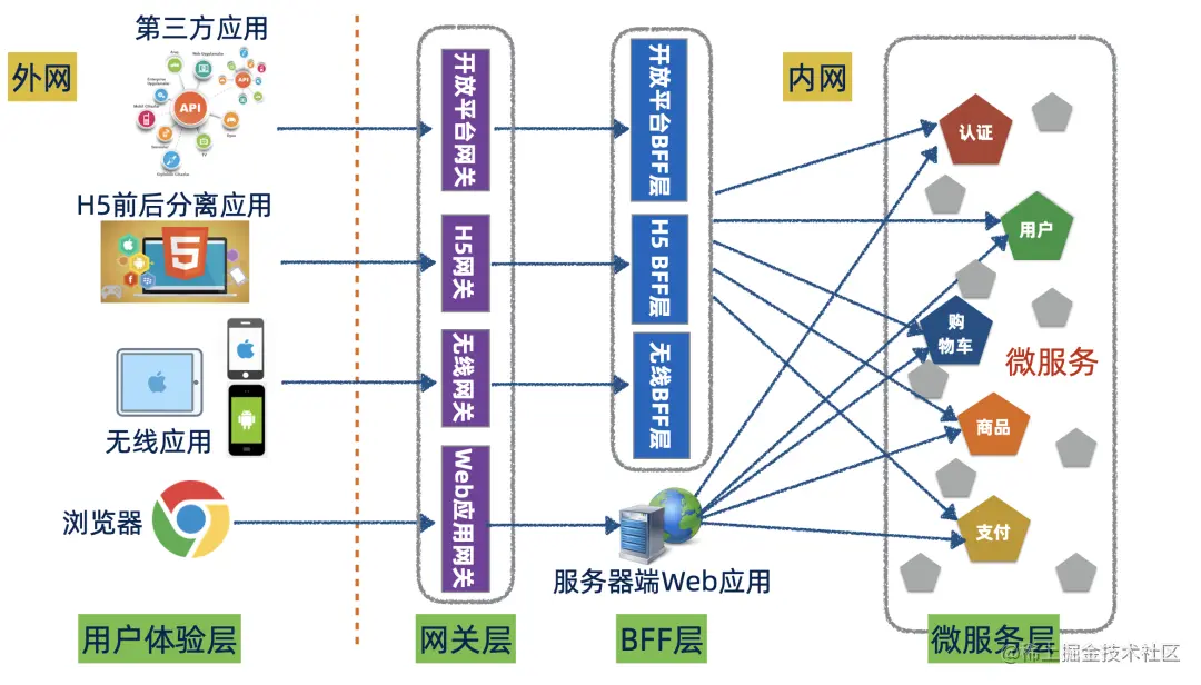 前面我们将 API Gateway 的网关选型介绍了一下,请求通过网关后一般不会直接打到具体微服务上的,而是会通过BFF层,所谓的BFF,即 backend for frontend 面向前端的后端。具体来说它的职能包括: