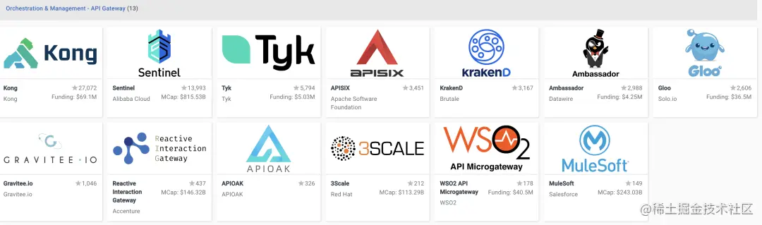 市面上基于OpenResty 以 API Gateway 为应用场景的应用软件有 Kong、APISIX、tyk 等。以下是CNCFland scape 的一个概览
