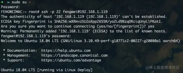 【小知识】 mac终端使用ssh连接远程服务器 wittewey 2020-10-13 936 阅读1分钟 打开终端,输入 sudo su - 进入根目录 输入 ssh -p 22(端口号) fengwei(服务器名)@192.168.1.119(ip) 回车,然后输入 yes 输入密码 连接成功