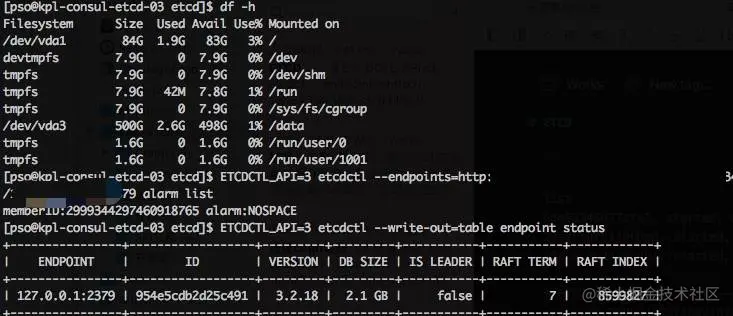 似乎磁盘、内存空间都足够的。从官网的信息了解到应该是etcd配额的问题,Etcd v3 的默认的 backend quota 2GB,也就是说etcd默认最大的配额是2GB,如果超过了则无法再写入数据,要么把旧数据删除,要么把数据压缩了。
