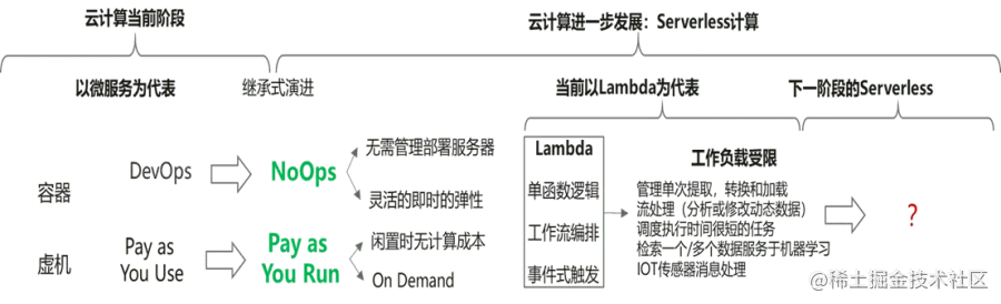 Serverless当前相对比较正式的定义(CNCF白皮书)有几个特征:是云计算形态的进一步发展,相对于当前云计算,它带来两个关键好处:NoOPS和Pay as You Run。现阶段Serverless技术的实现形态,以AWS发布的Lambda为代表,其他还包括微软Azure Function,谷歌Cloud Functions等。在2019年伯克利发布《Cloud Programming Simplified》展望中,把Serverless定义为云计算的下一代计算范式。云计算从微服务技术主导到Serverless技术的演进,我们看看云计算的本质就可以比较好的理解这些技术背后的逻辑,也就能理解为什么伯克利继成功断言云计算的兴起之后,把目光聚焦在Serverless技术上呢?