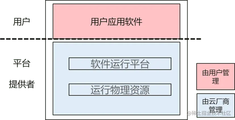 **首先,**从云计算的服务形态来看,对于企业应用及其基础设施,现在变成了用户和基础设施提供商两个层次,如下图所示。这个逻辑层次的划分很重要,在软件生态中原来基础设施平台和应用软件都是由用户自己管理和维护,这时出现了专业的平台提供者的角色,来提供基础设施。
