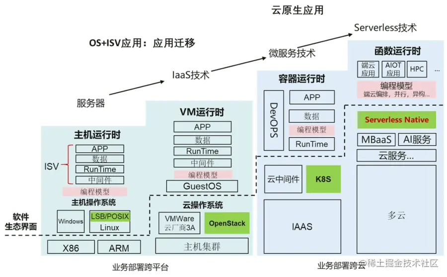 云计算的兴起,在CPU硬件能力大力发展之后,得益于OS+ISV的软件生态和虚拟化技术的成熟。云计算巧妙地延续OS+ISV生态,把ISV可以无缝地迁移到云上。云vendor利用虚拟化技术,对客户提供IAAS服务。满足客户:1、应用软件运行条件没有发生变化;2、不用维护物理主机,只需要关注应用软件本身。